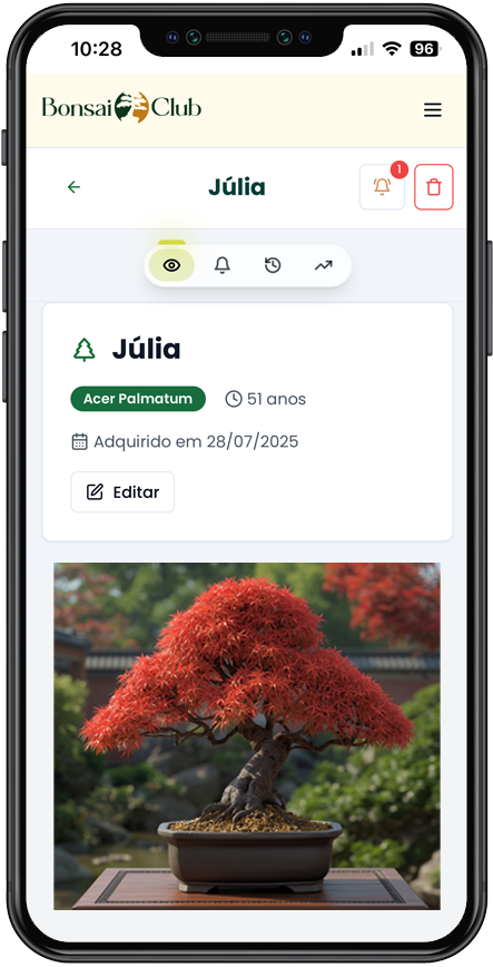 Registre cada ação feita no bonsai e construa um histórico detalhado do cuidado e evolução da planta.