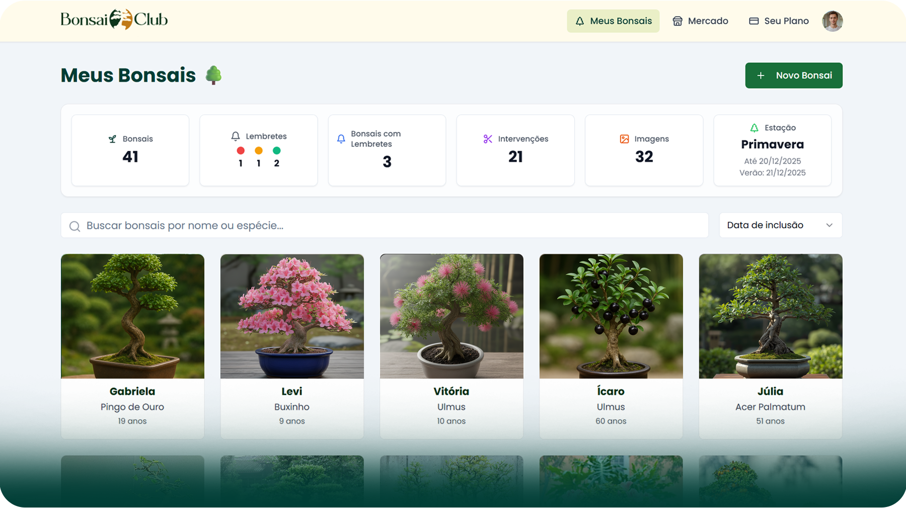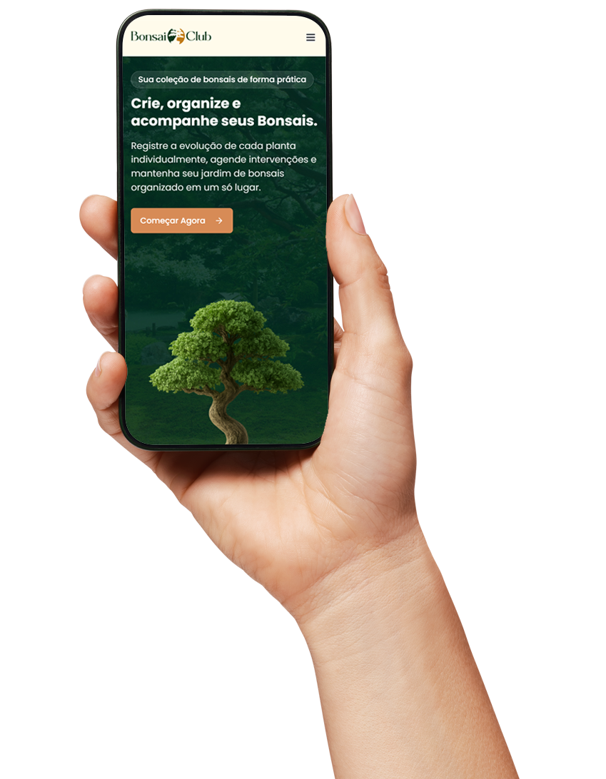 O Bonsai Club é um web app feito para ajudar você a organizar e cuidar dos seus bonsais. Ele reúne lembretes, histórico de intervenções, evolução com fotos e uma comunidade apaixonada por bonsais.