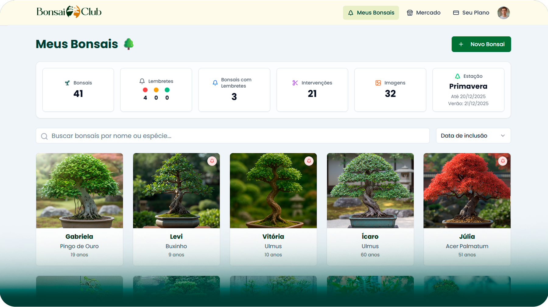 O Bonsai Club é o app feito para bonsaístas que querem organizar, cuidar e evoluir seus bonsais com praticidade.