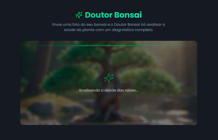 Seu bonsai está perdendo folhas e você não sabe o que fazer? Não arrisque…com o Doutor Bonsai, basta tirar uma foto da sua planta para receber um diagnóstico completo em segundos. Identifica pragas, fungos e erros de rega, entregando o tratamento exato que sua árvore precisa para sobreviver e voltar a brilhar.